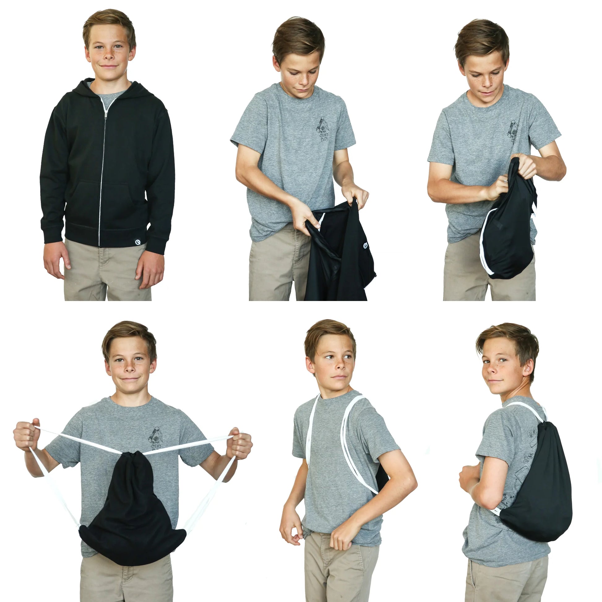 Ob auf dem Spielplatz oder im Park, Kinder verlieren ihre Hoodies, wenn sie sie ausziehen und nicht wissen, wohin mit ihnen. Mit unserer patentierten Quikflip®-Umwandlungstechnologie lässt sich jeder leichte Hero Hoodie für Kinder in Sekundenschnelle in einen funktionellen Rucksack verwandeln. So haben sie immer eine einfache (und coole) Möglichkeit, ihn zu tragen, egal bei welchem Wetter!